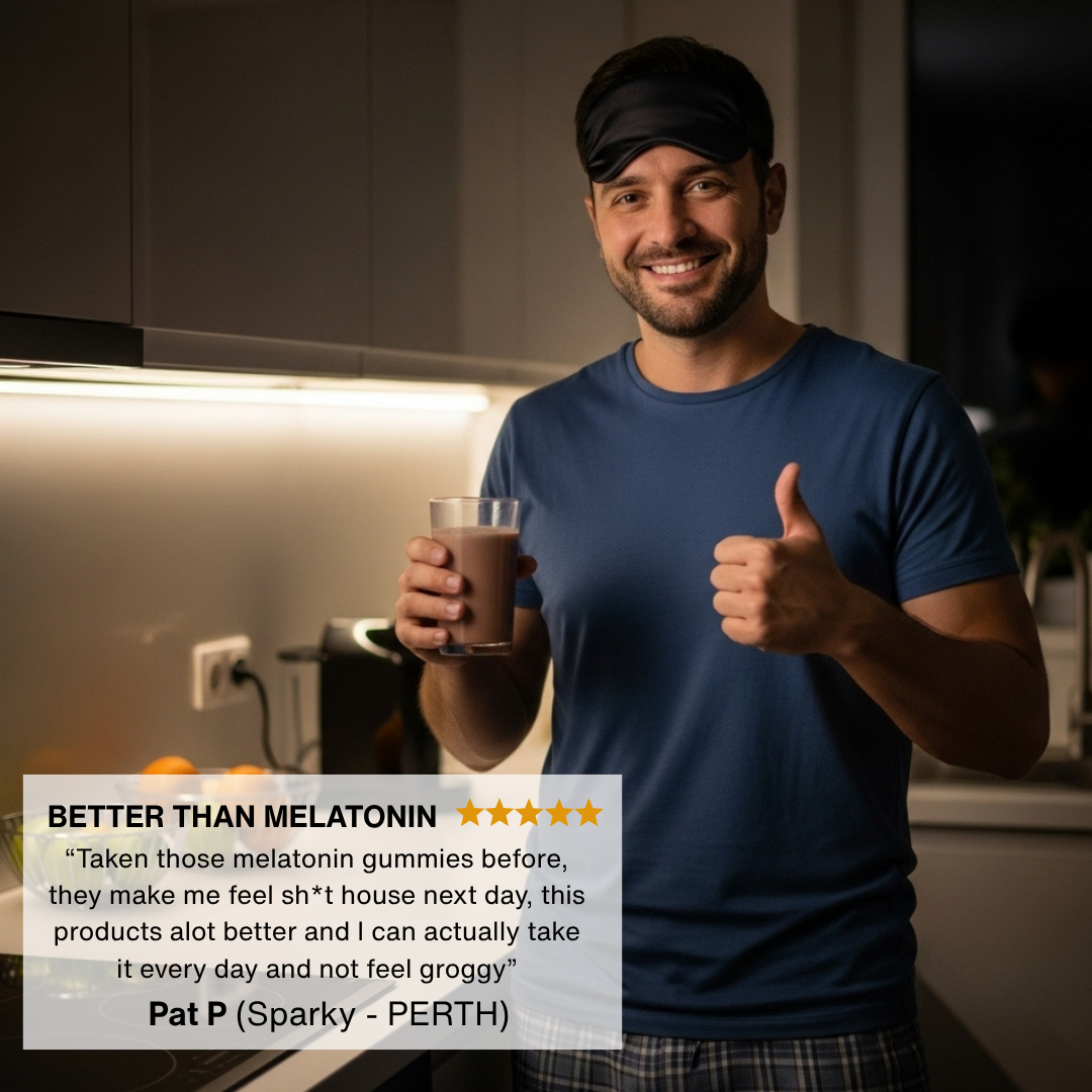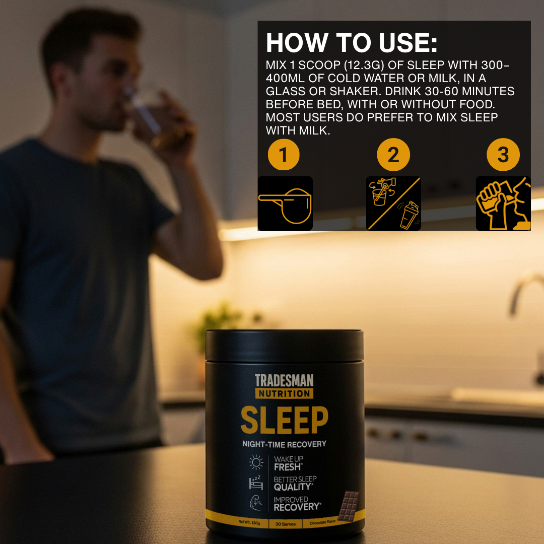 Mix 1 scoop of Sleep 30-60 minutes before bed, either mix Sleep with water or milk, most blokes prefer the taste when mixed with milk. Take Sleep preferably without food.