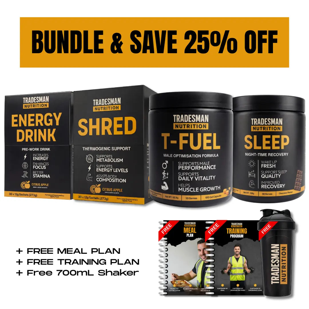 Plus Free Training Program and Meal Plan E-Books to maximise your results and Tradesman Nutrition Shaker.
